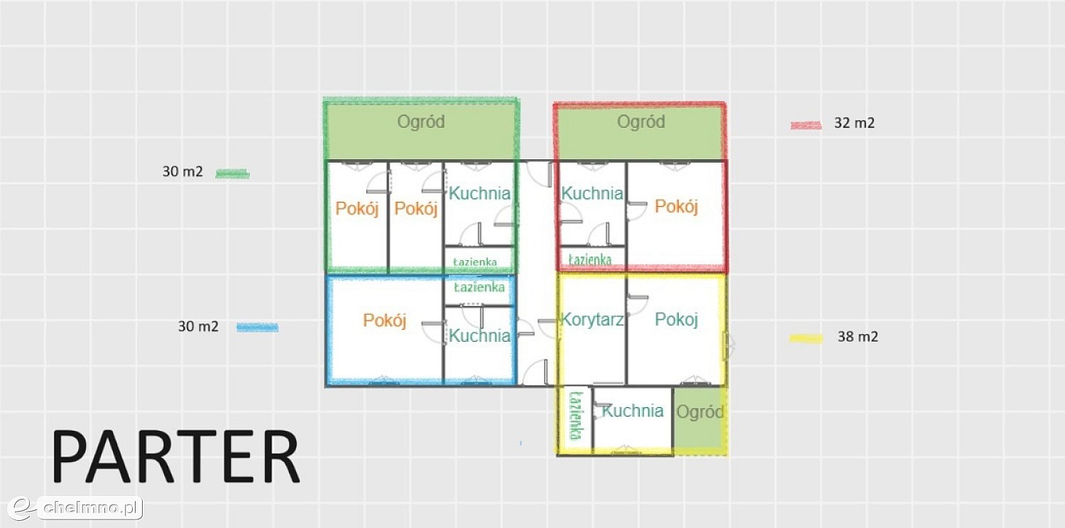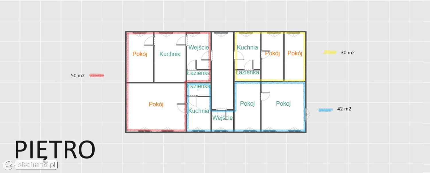 10. 60 m2- kuchnia, łazienka, wc, dwa pokoje.