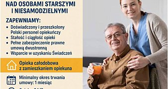 Promuj ogłoszenieZapewniamy stałą, troskliwą opiekę domową - opiekun zamieszka z Podopiecznym i zadba o jego codzienny komfort, bezpieczeństwo i aktywność. Oferujemy wsparcie ... czytaj więcej