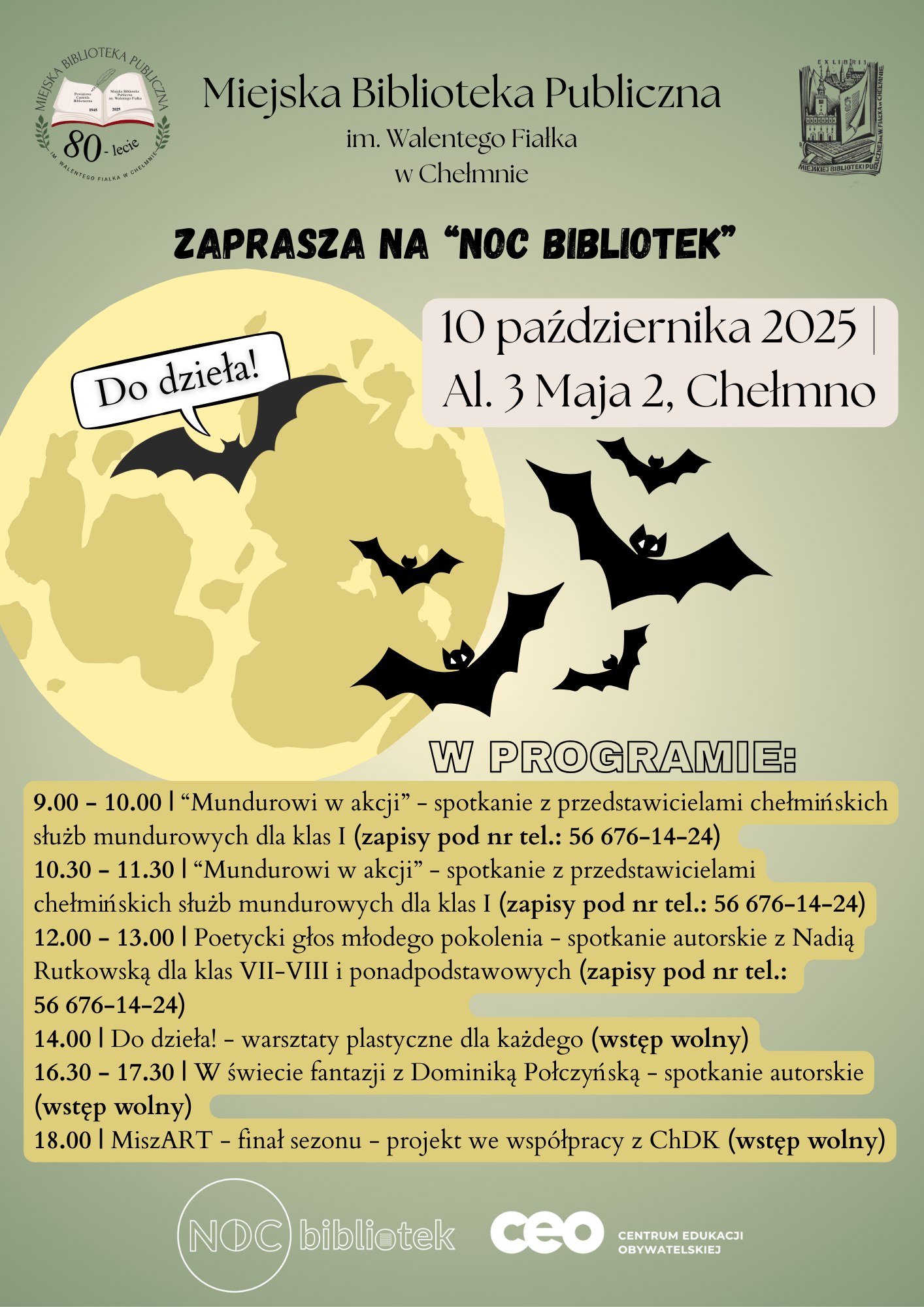 Wielkimi krokami zbliżamy się do kolejnej „Nocy Bibliotek”. Tegoroczne hasło brzmi inspirująco: „DO DZIEŁA”. Z taką myślą przygotowaliśmy wiele atrakcji dla dzieci, młodzieży i dorosłych.